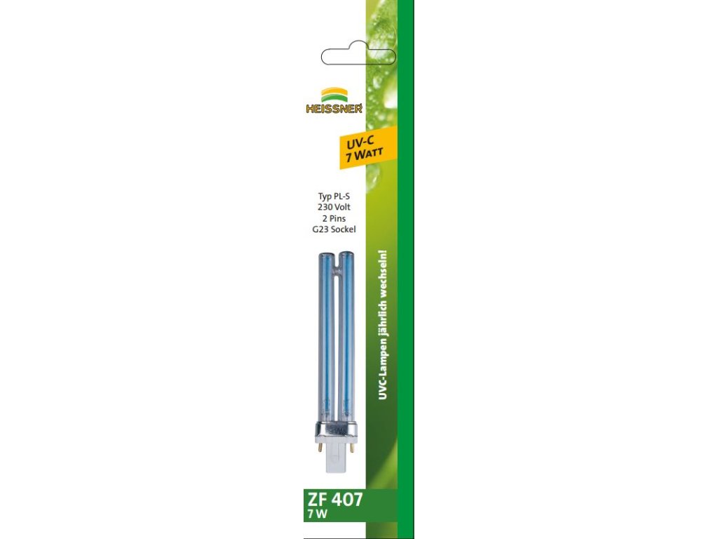 UV zářivka HEISSNER ZF407-00 s výkonem 7 W a paticí G23 je vhodná pro menší UV lampy. Typ PL-S, délka 135 mm, životnost až 8 000 hodin. Spolehlivě redukuje řasy a sterilizuje vodu v jezírku. Doporučená výměna po každé sezóně.